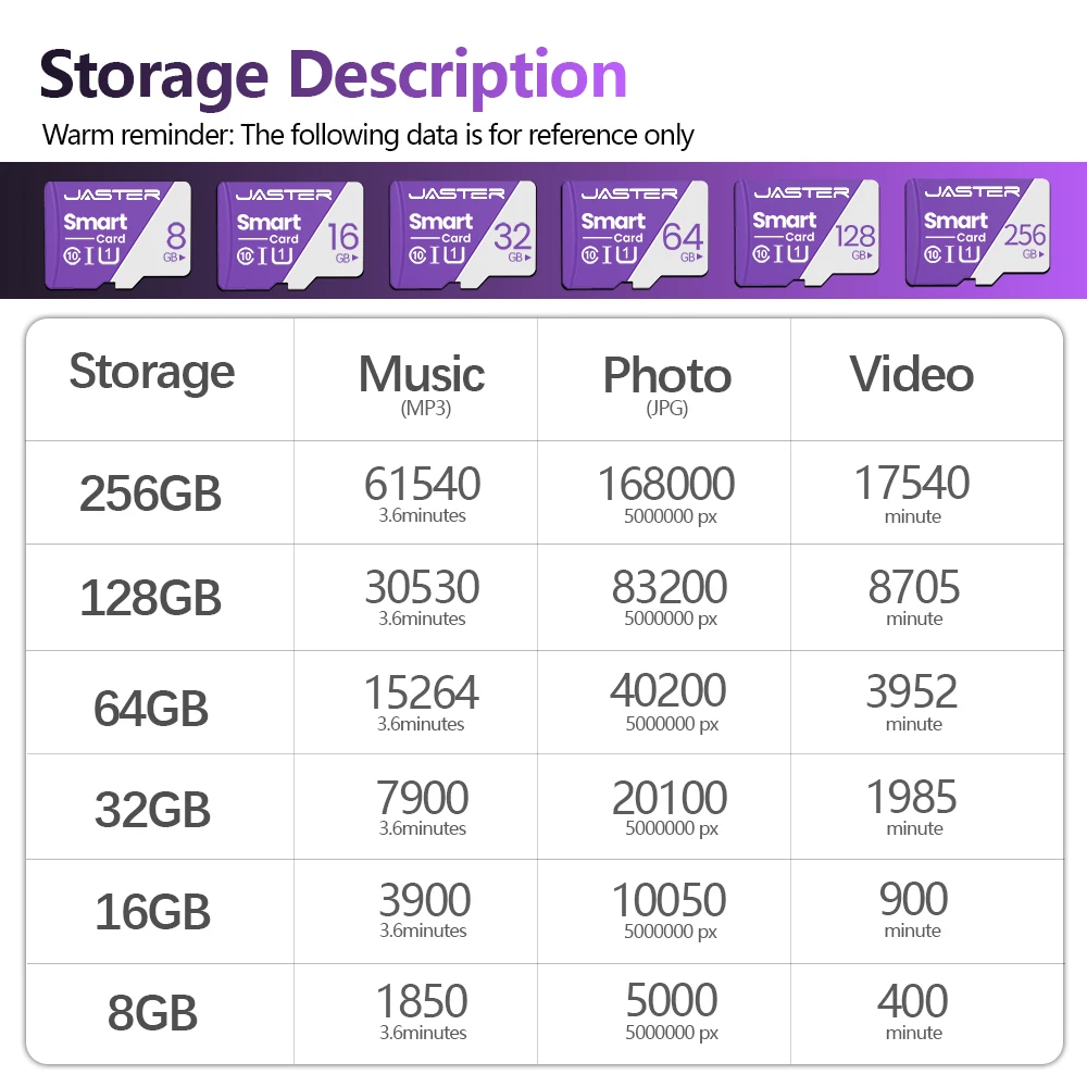 JASTER Original Memory Card 128GB High Capacity Flash Card 64GB Class 10 High Speed Reading TF Card 32GB Purple SD Card 16GB 8G